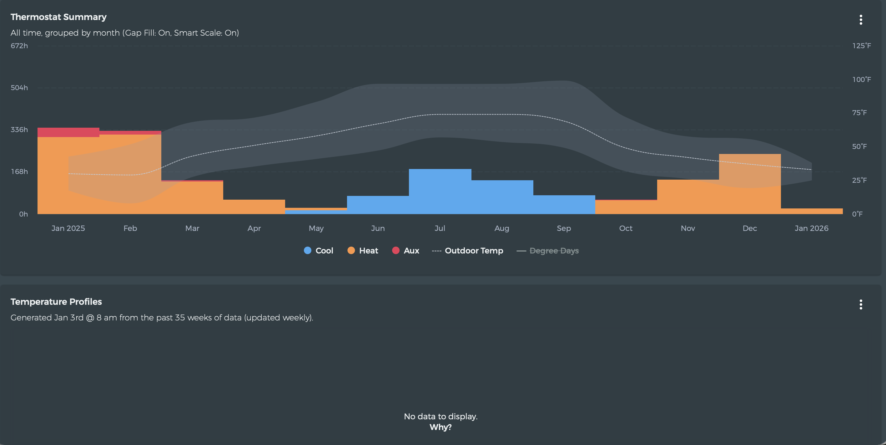 Hello, I am new to Beestat but not Ecobee. I have 2 homes with 2 thermostats each (all 4 thermostats show up in Beestat). The first home has had Ecobee’s since 2017. In this home the thermostat in the house shows a years worth of data but no profiles. The thermostat in the garage (heat only) does show a profile based on the last year. The thermostats in the second home are newly installed (last month). The downstairs thermostat doesn’t show a profile. The upstairs does show a profile but with only a resist line. I am mostly wondering why my first home with a years data doesn’t show any profile?