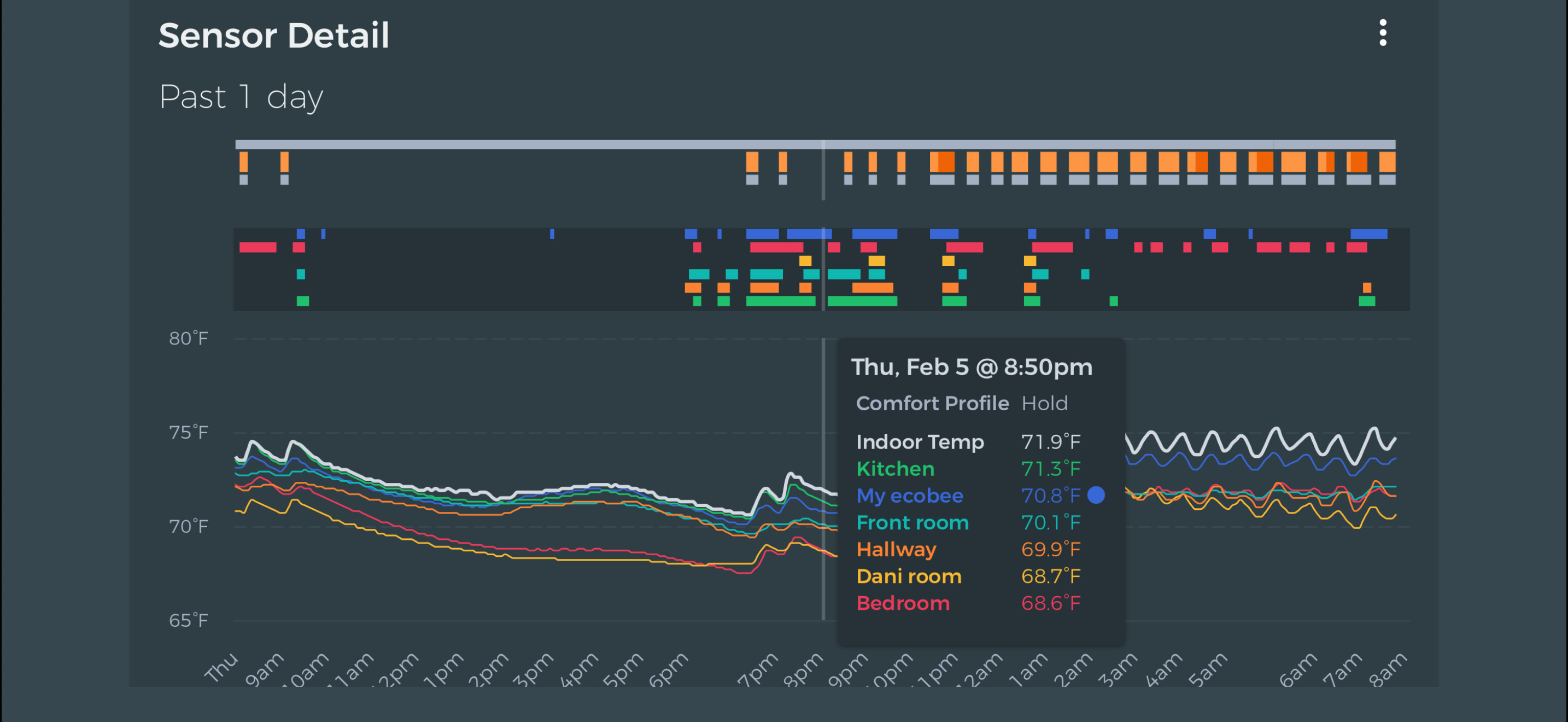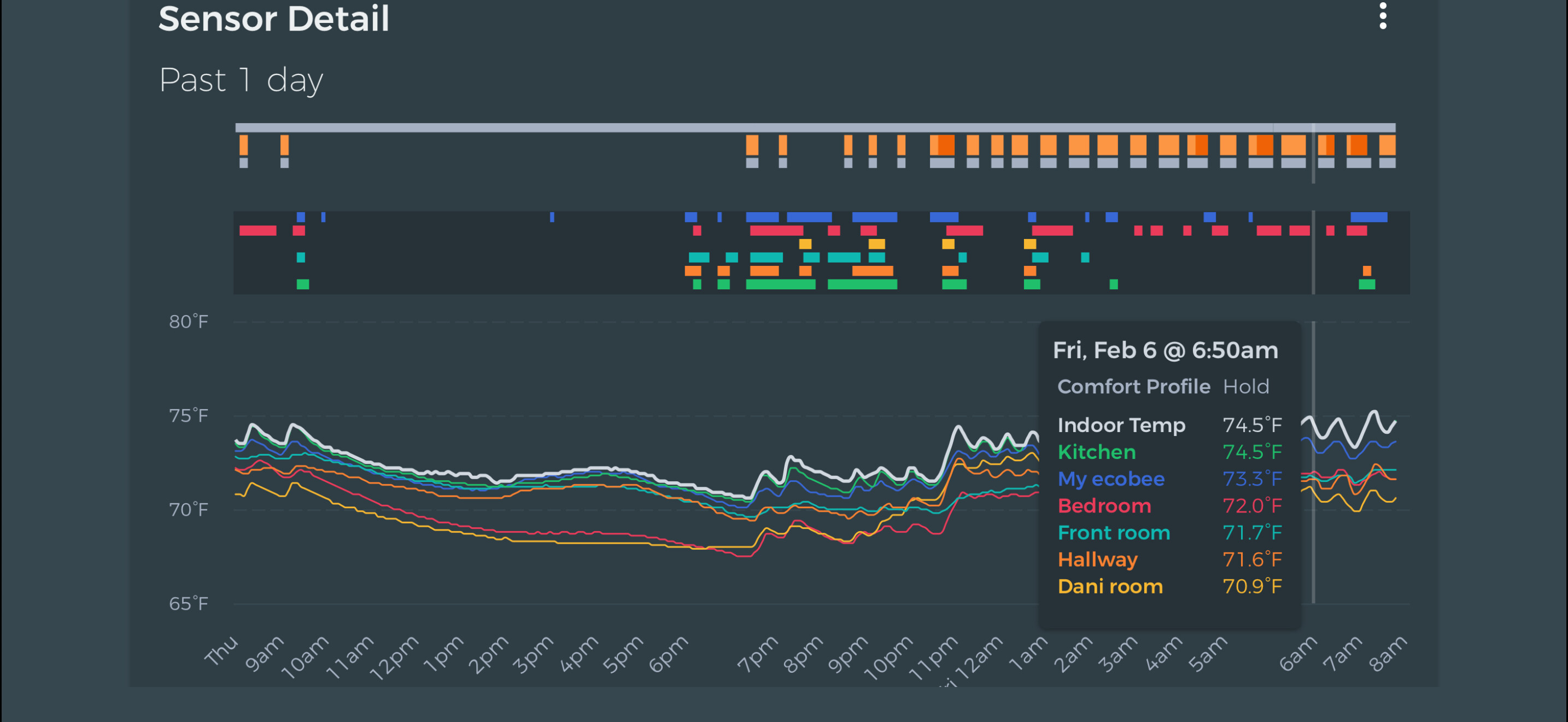 I have 6 indoor temp sensors including the ecobee thermostat and I use 1 (kitchen) to set the temp of the home. I believe operating in a temp hold (vs a schedule) averages all sensors evenly to provide the inside temp (vs using a selected sensor. My issue is that the “indoor temp” line is sometimes outside any of the individual readings, and other times it’s within the range of the other sensors (as expected). How can the average be outside any individual sensor? Photos below are all within a hold setting, the “indoor” graph aligns with the kitchen sensor when operating in a schedule.