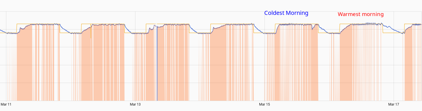 When the weather is mild (-5C to 5-10C), my heat pump has a really hard time recovering from the lower temperatures set during the night and even has a hard time keeping up during the day. I’m not sure how much control the Ecobee has over this (might be defrost related? although I don’t see any ice on the heat exchanger) and it might be purely on the heat pump side. Is there something wrong here? The heat pump is able to keep up just fine without aux when it’s -25C outside.