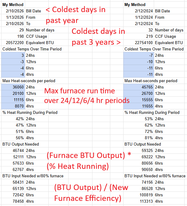 Btu/hr Input of Replacement = 1.4 * Runtime per Degree Day/1440 * (68°F - Design Temp) * Current Furnace Btu/hr Output / AFUE of Replacement