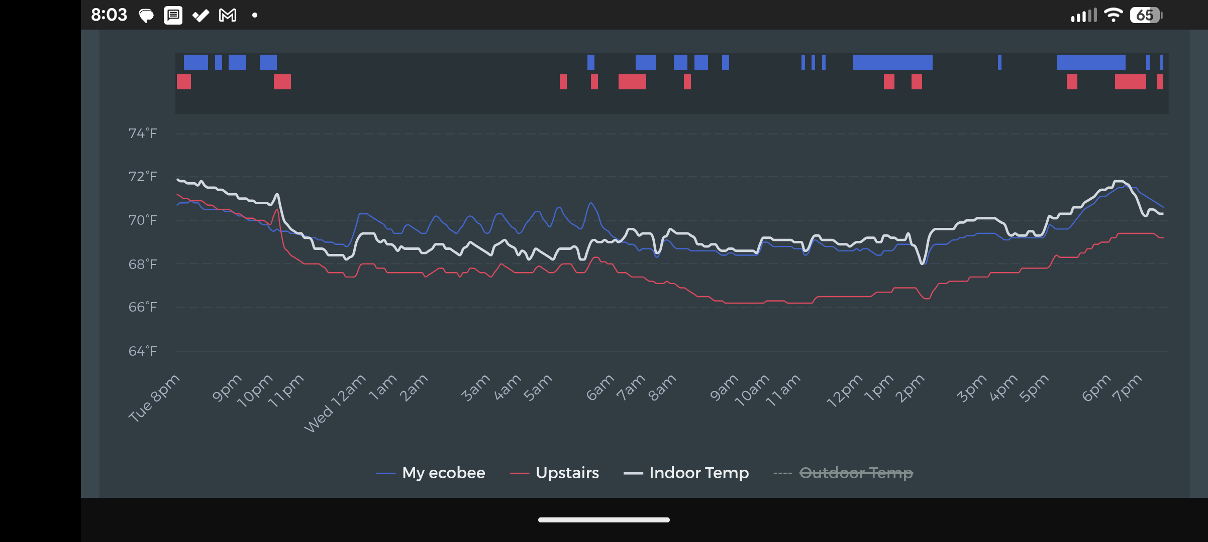 My upstairs has its own heat/cool forced air unit. I mainly have the ecobee3 lite regulated based on the “Kids Room” temperature (blue). The thermostat itself is “Master Bedroom” in Red and suffers from self heating and draft changes when the 1st floor unit turns on (not shown). The Yellow signal is a sensor in the same room as the thermostat.